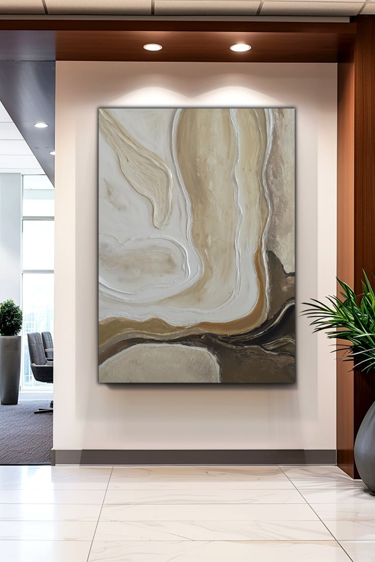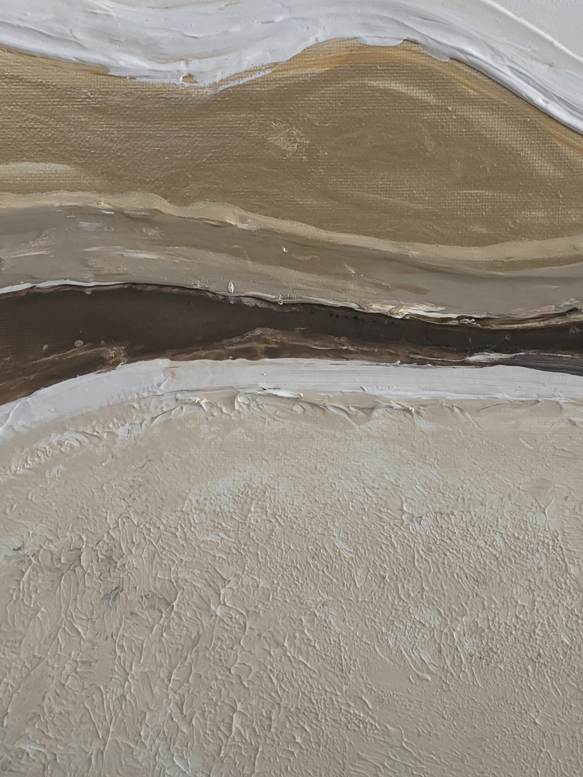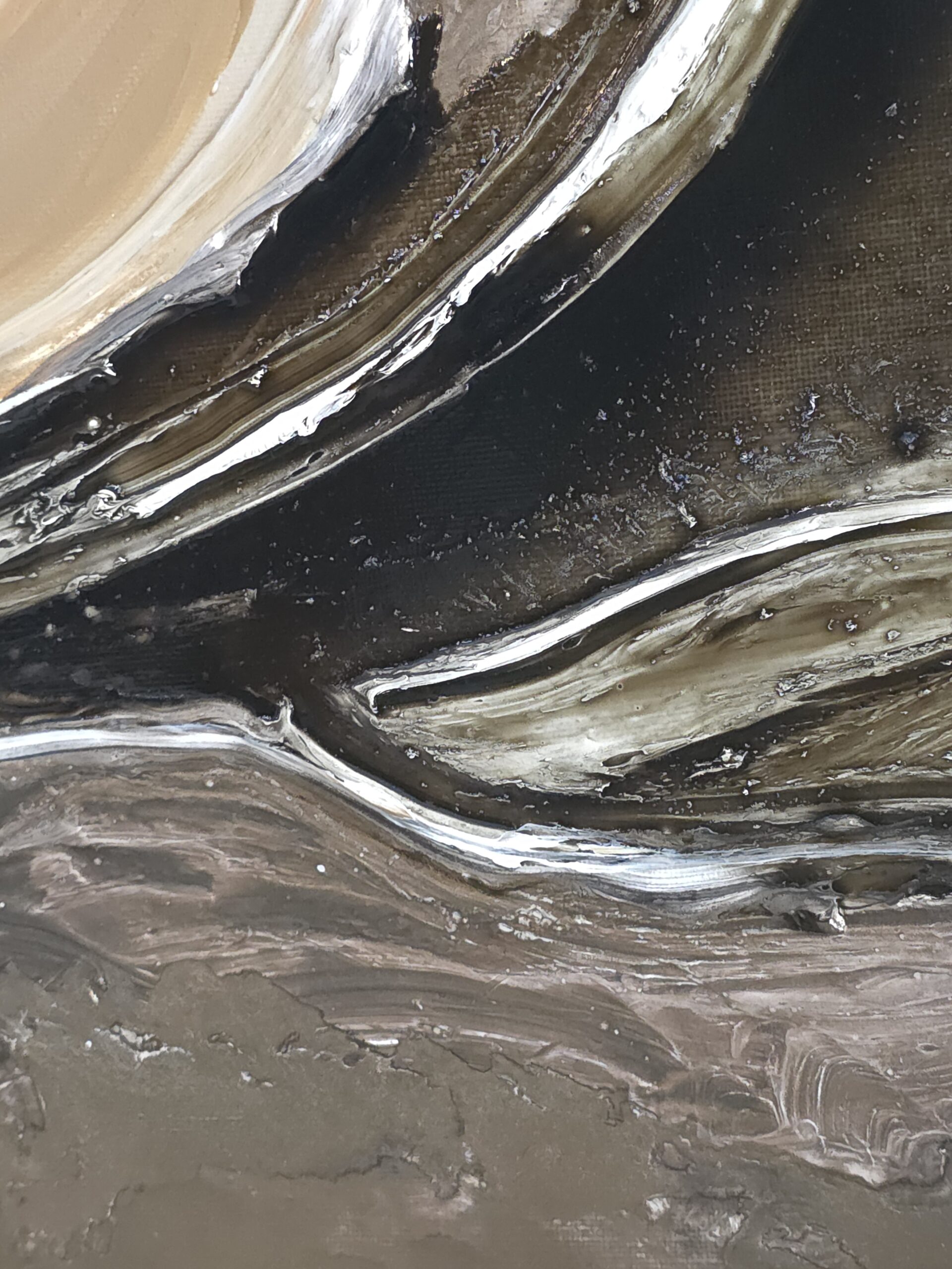 יצירה אבסטרקטית בגוונים חמים ומיטאלים עם טקסטורות מובלטות.