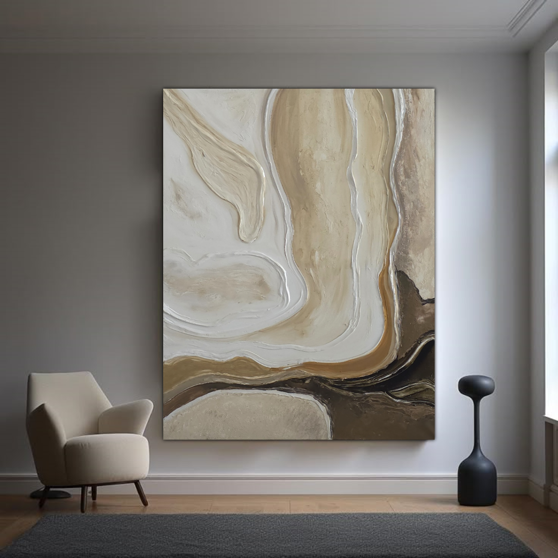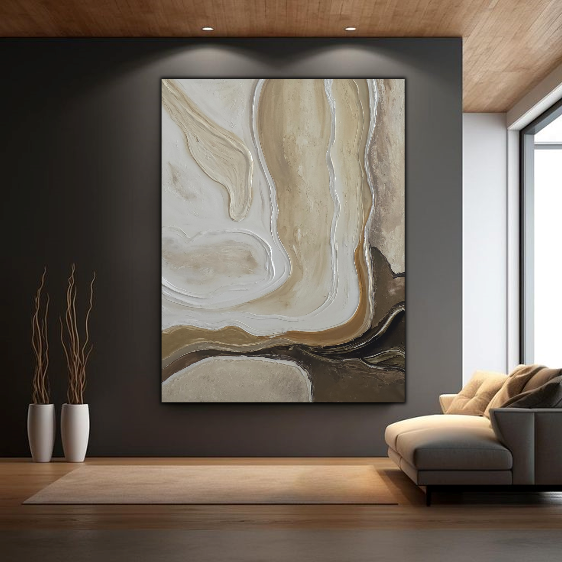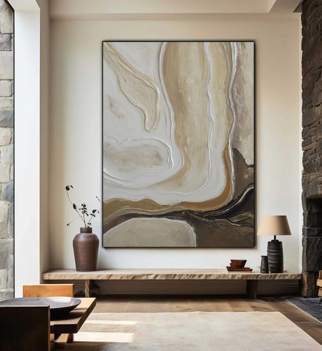 יצירה אבסטרקטית בגוונים חמים ומיטאלים עם טקסטורות מובלטות.