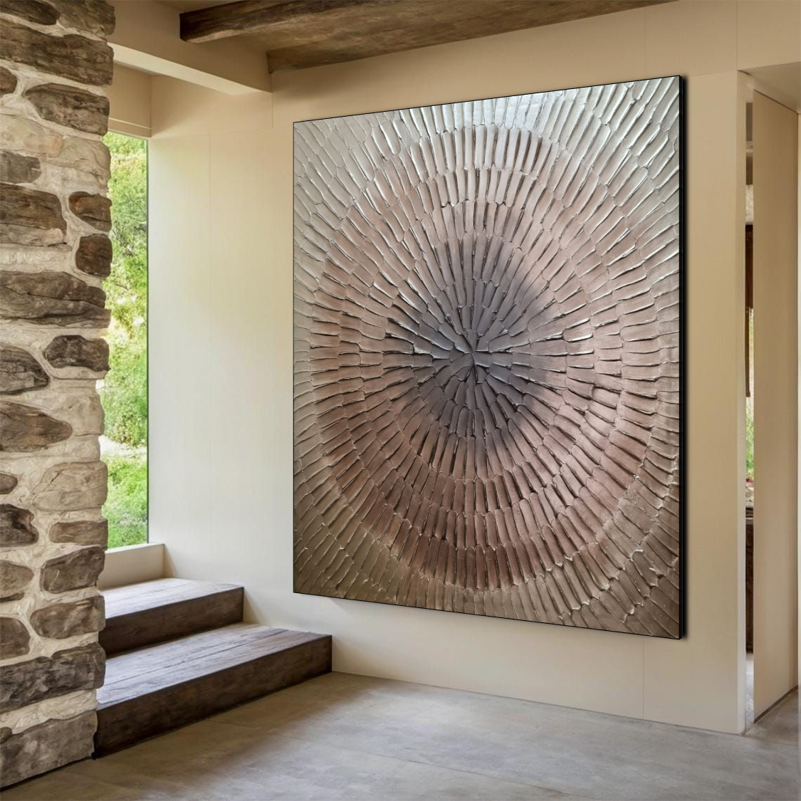 יצירה אבסטרקטית בגווני זהובים וברונזה מטלי עם משחות עיצוב וטקסטורות מובלטות.