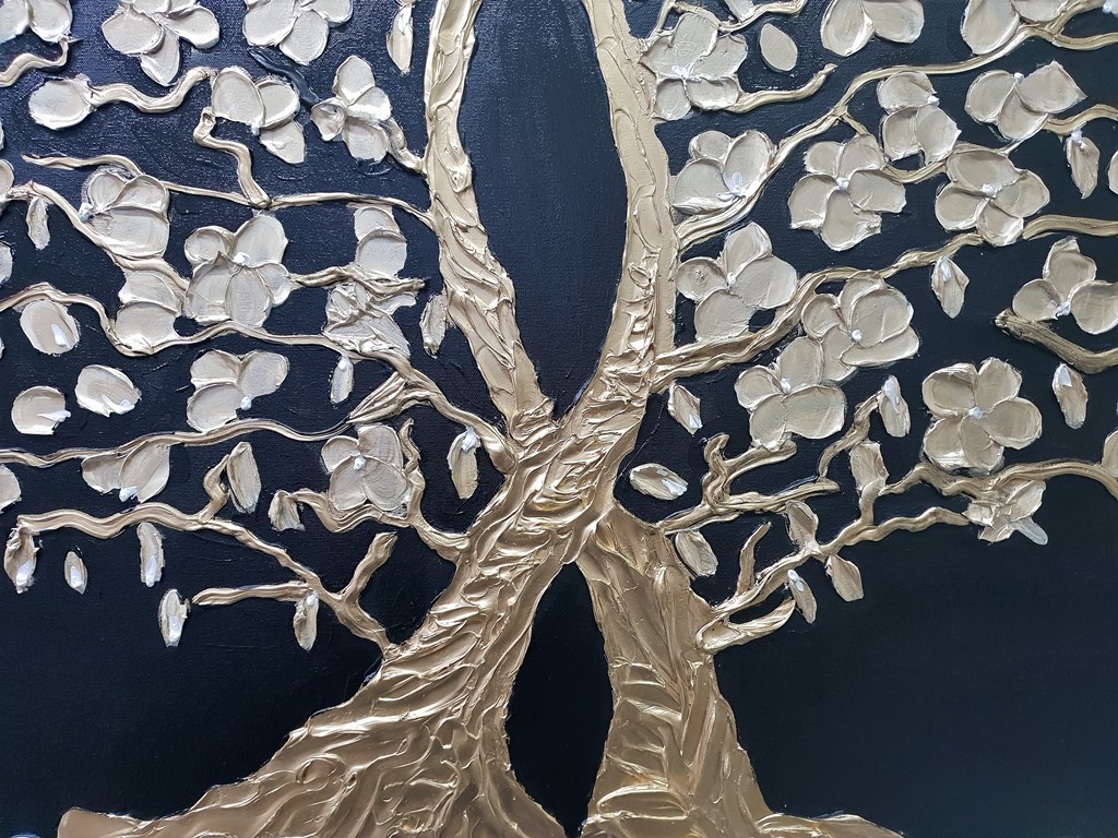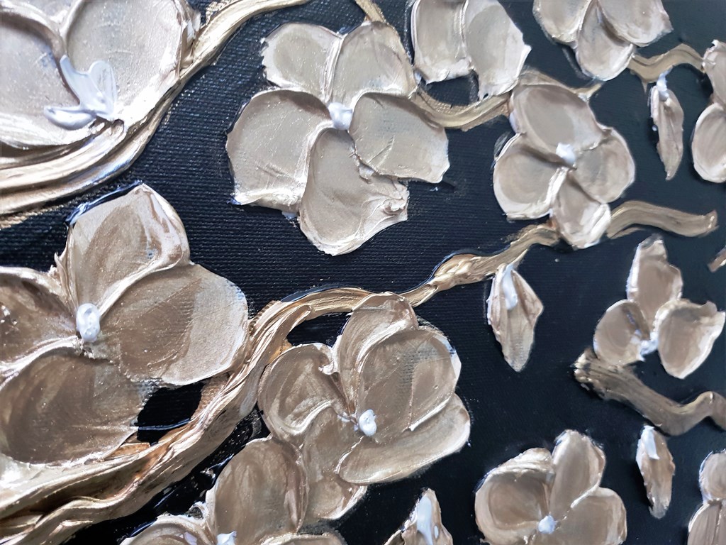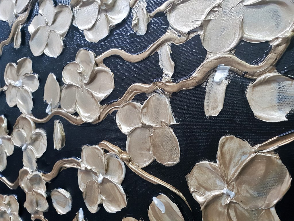 יצירה בעבודת יד של פריחה בגוונים זהב עם רקע שחור..