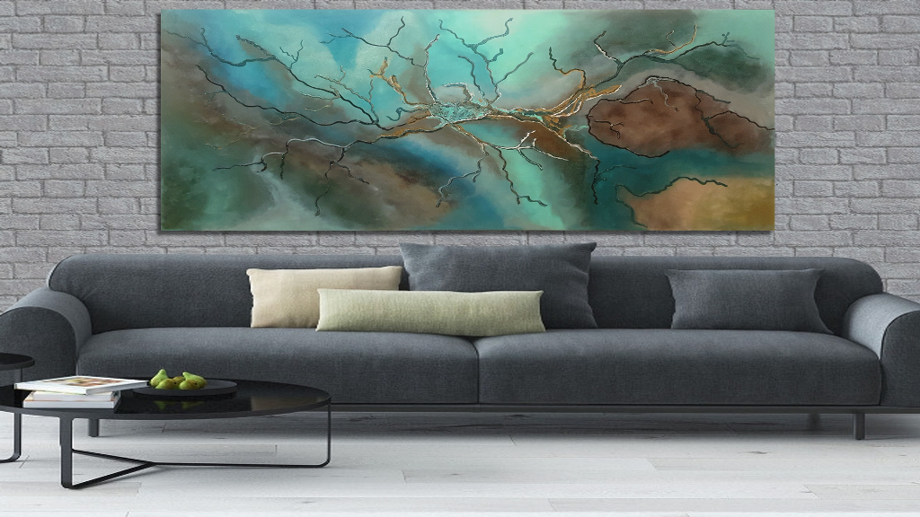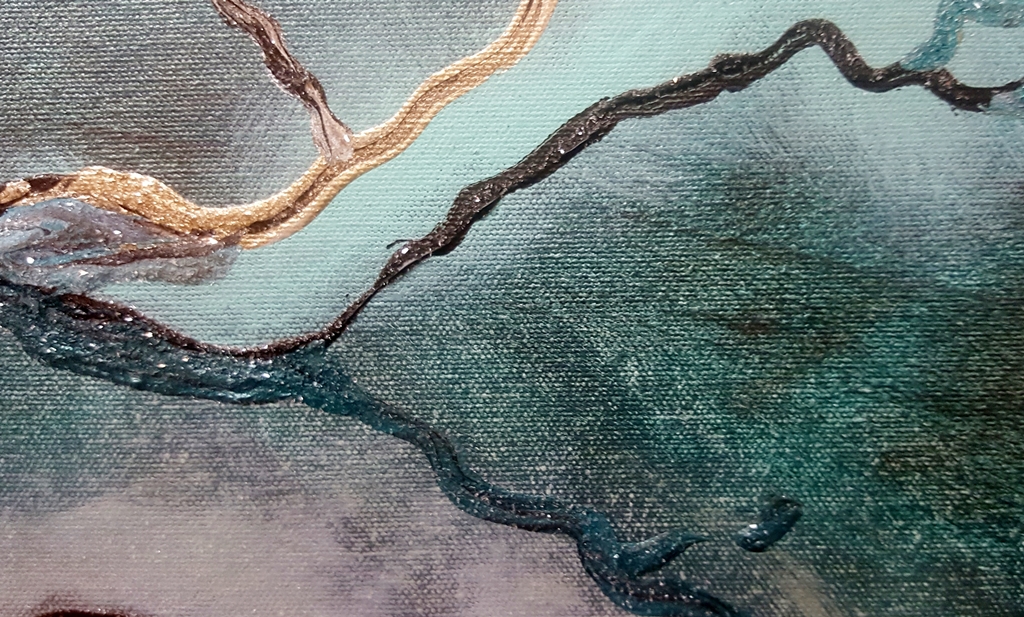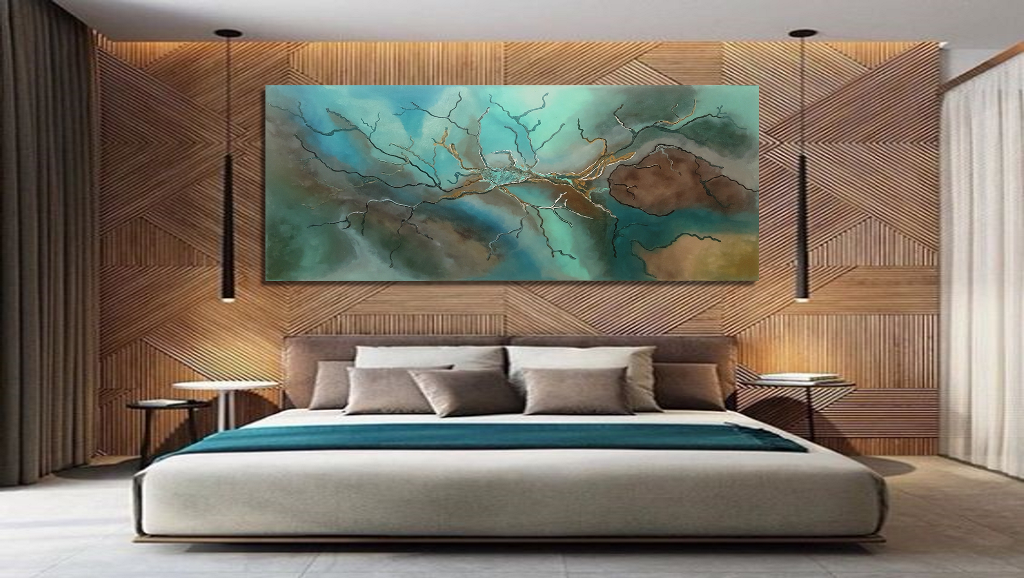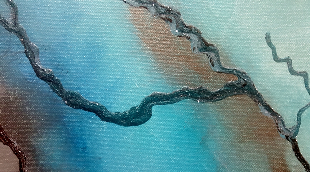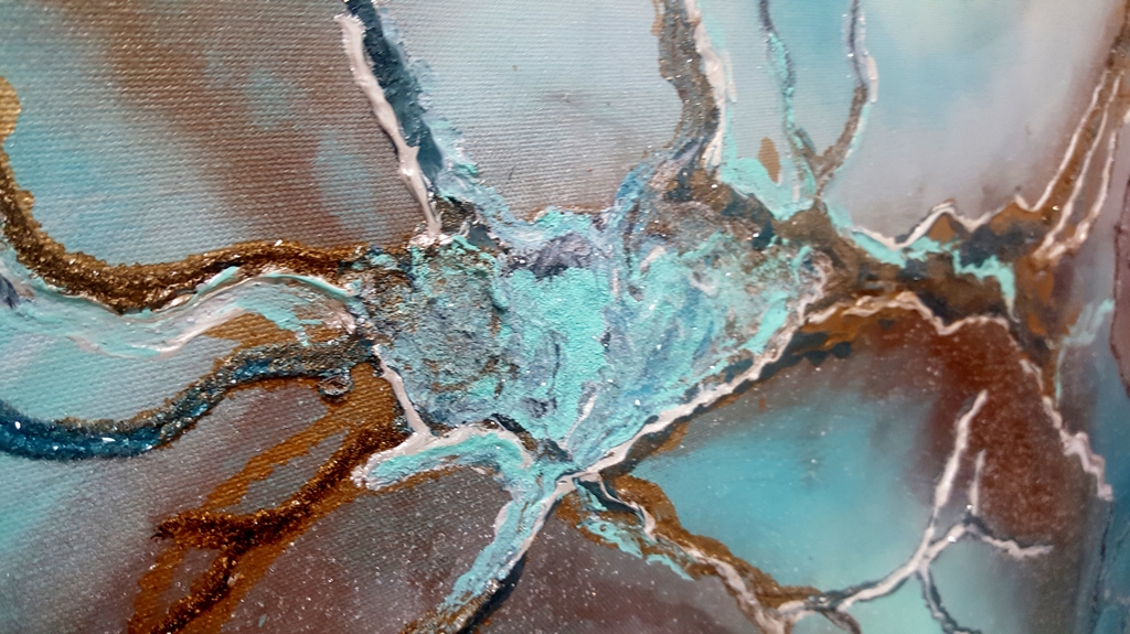 יצירה אבסטראקטית בעבודת יד של איים עם טקסטורות מובלטות וצבעים מרהיבים..