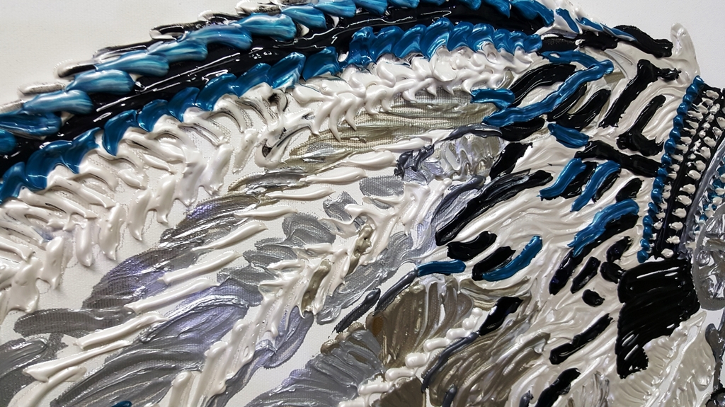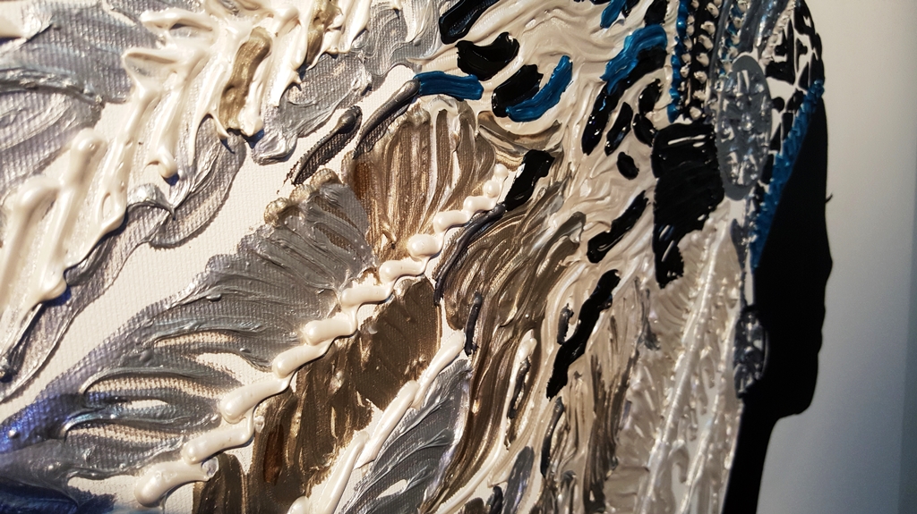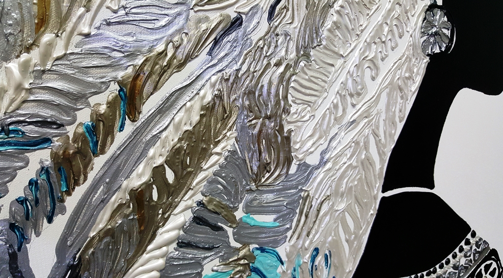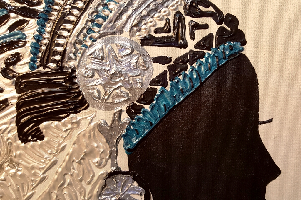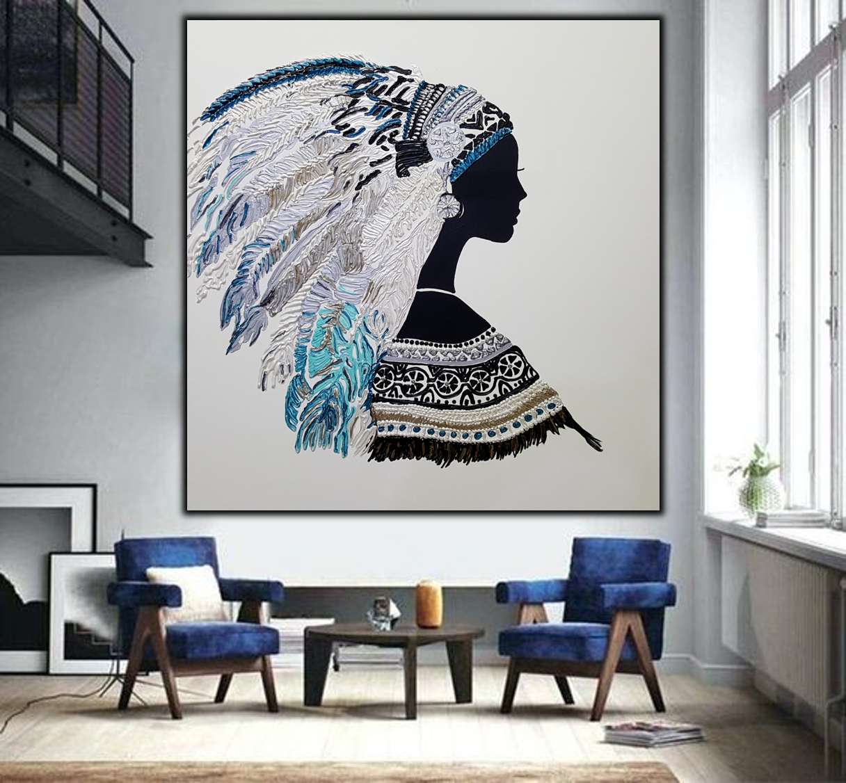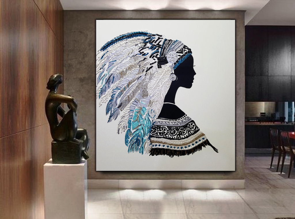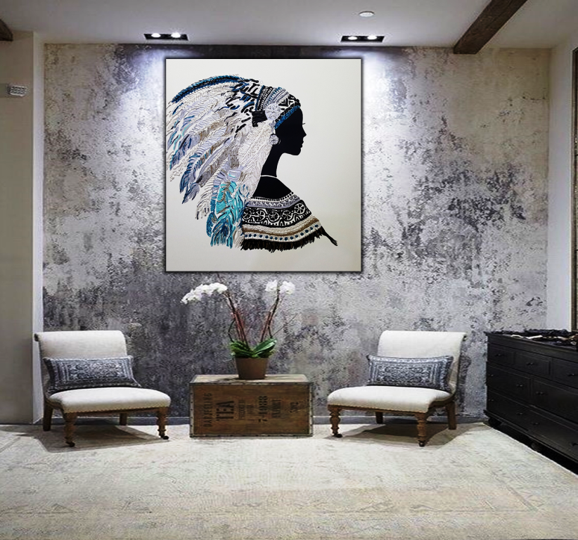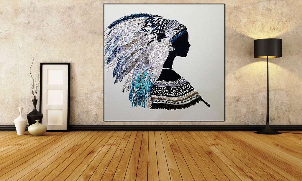 יצירה בעבודת יד של אישה אינדיאנית עם נוצות בטקסטורות מובלטות בגוונים טורקיזיים