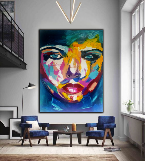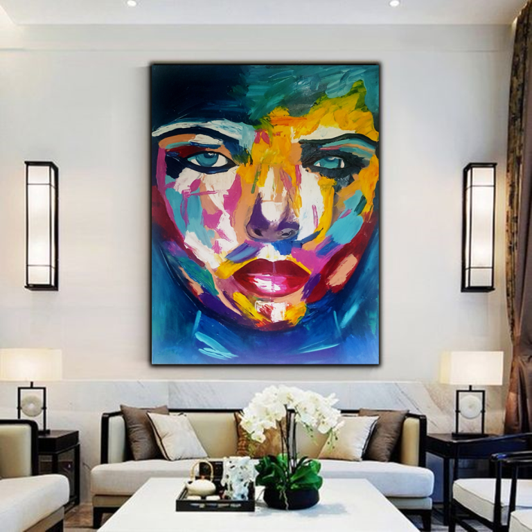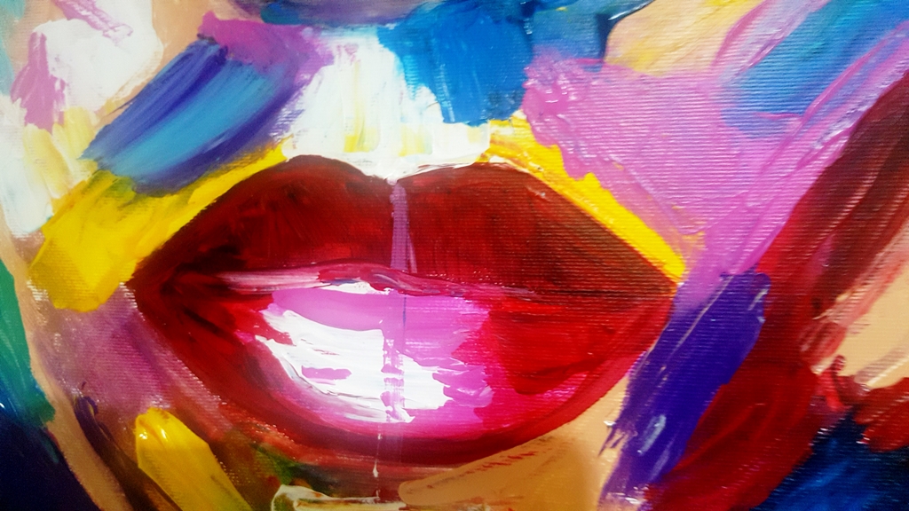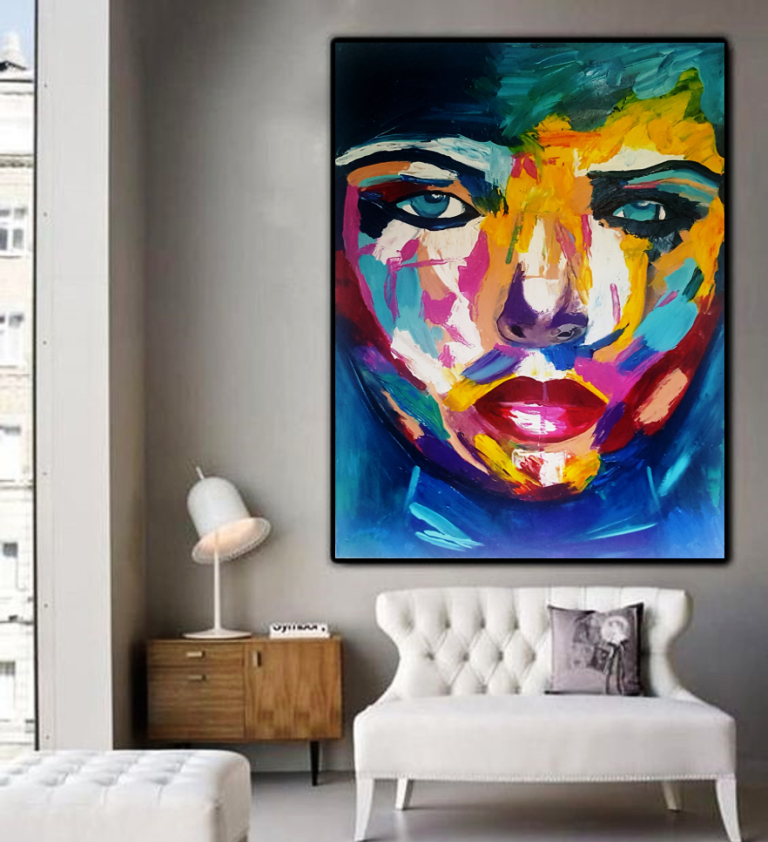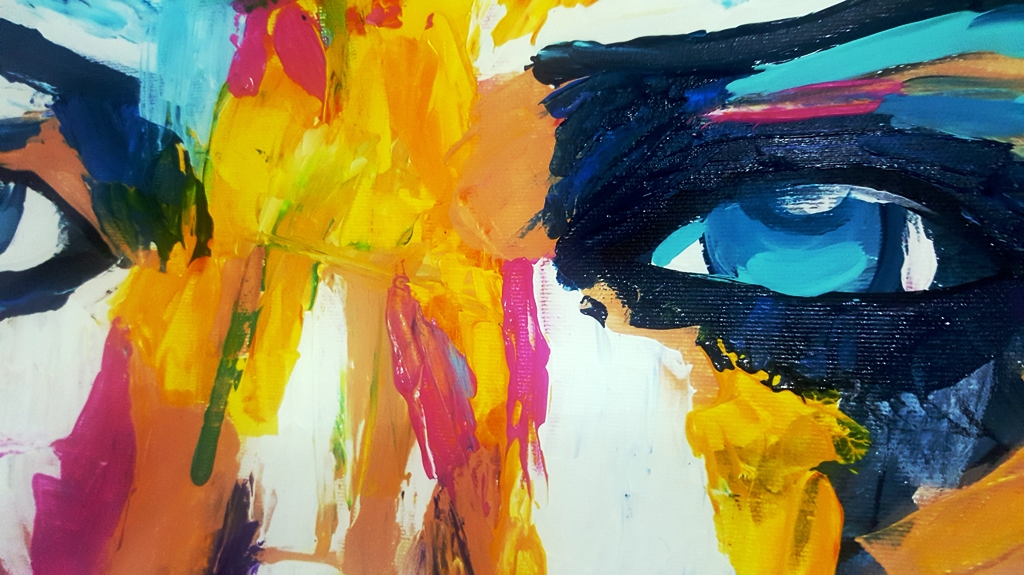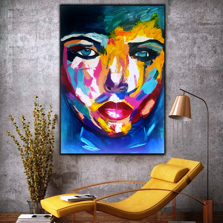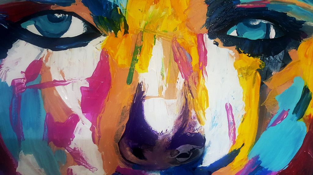 יצירה אבסטרקטית בעבודת יד של פני אישה עם צבעים בגוונים חיים…
