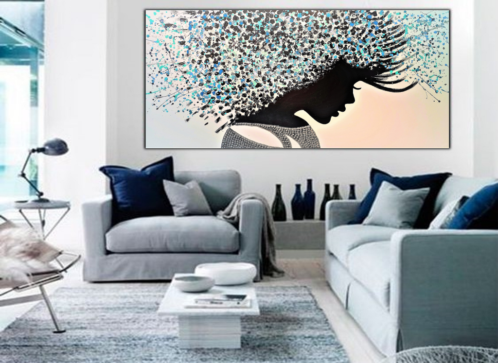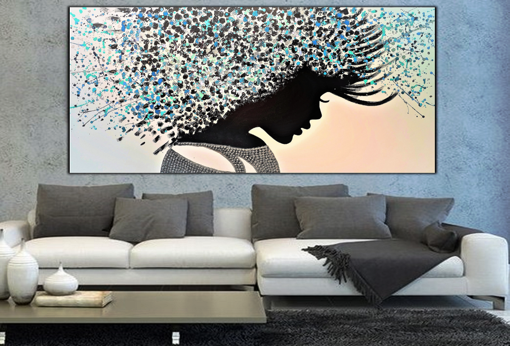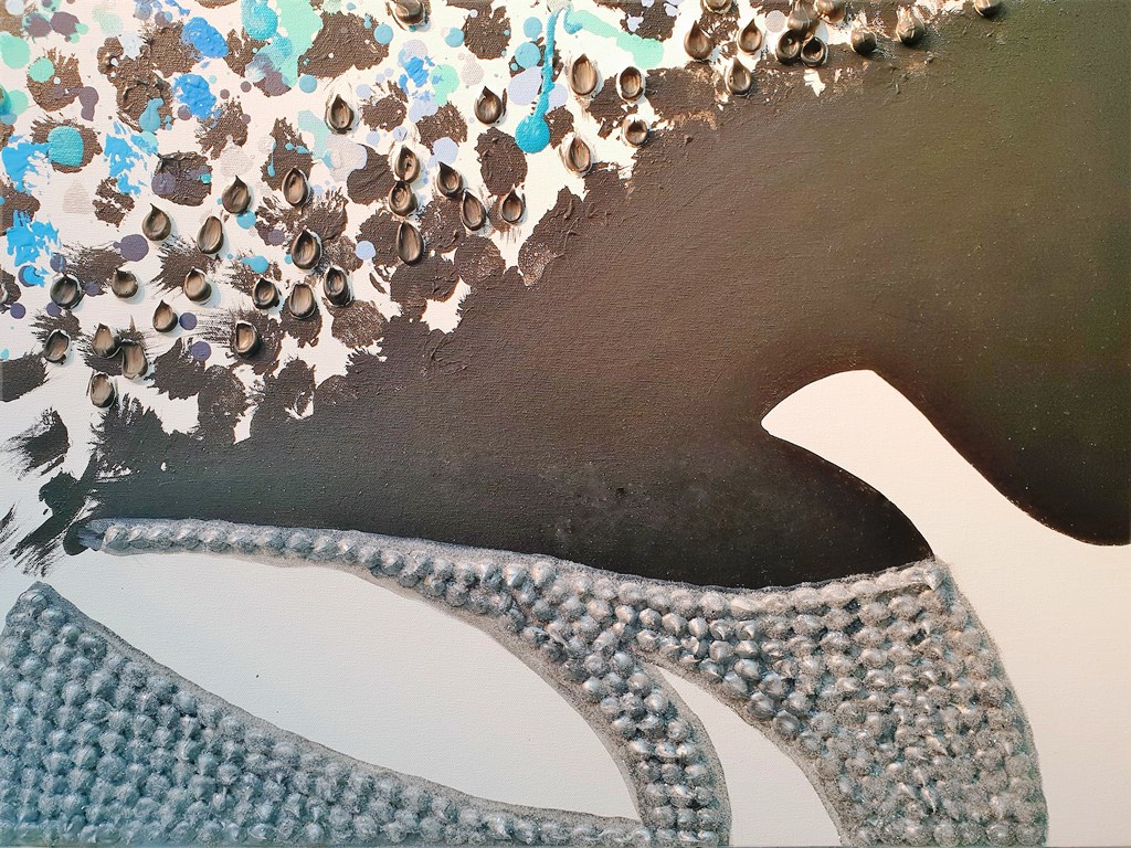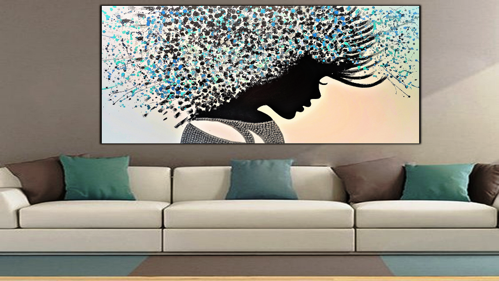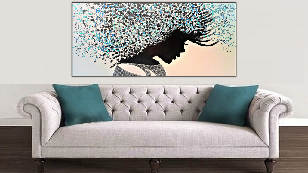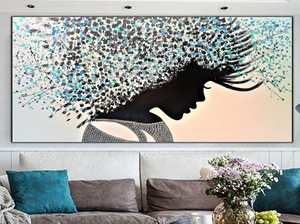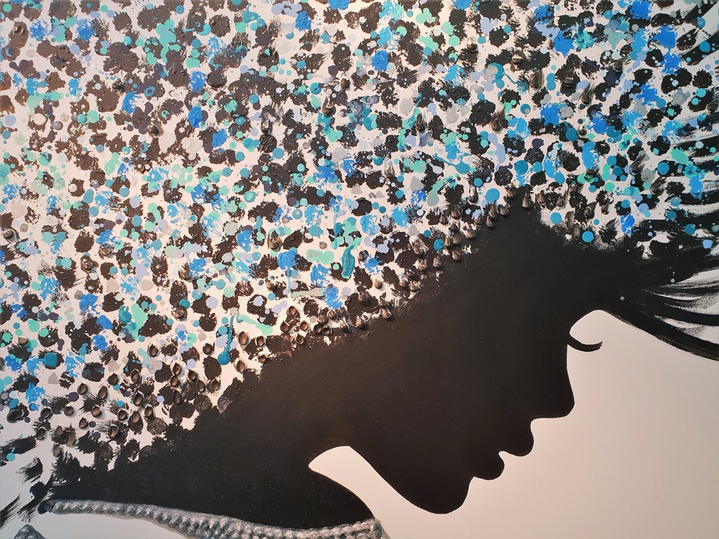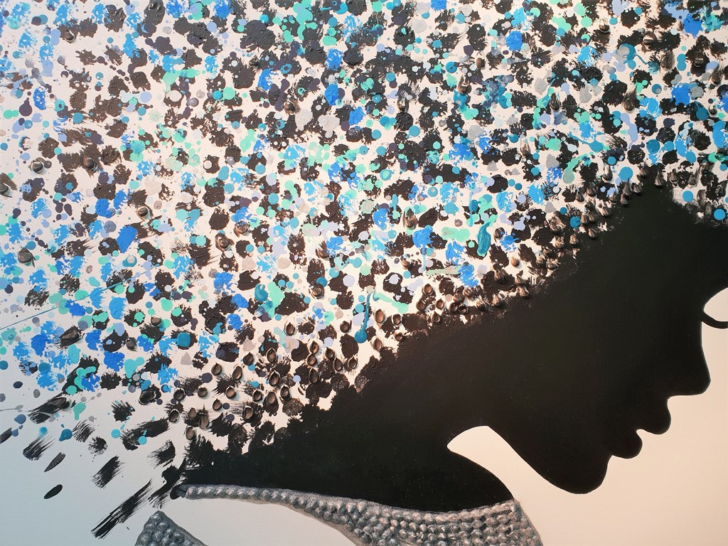 יצירה בעבודת יד של פני אישה עם בגד ושיער בטקסטורות מובלטות והזלפות צבע..