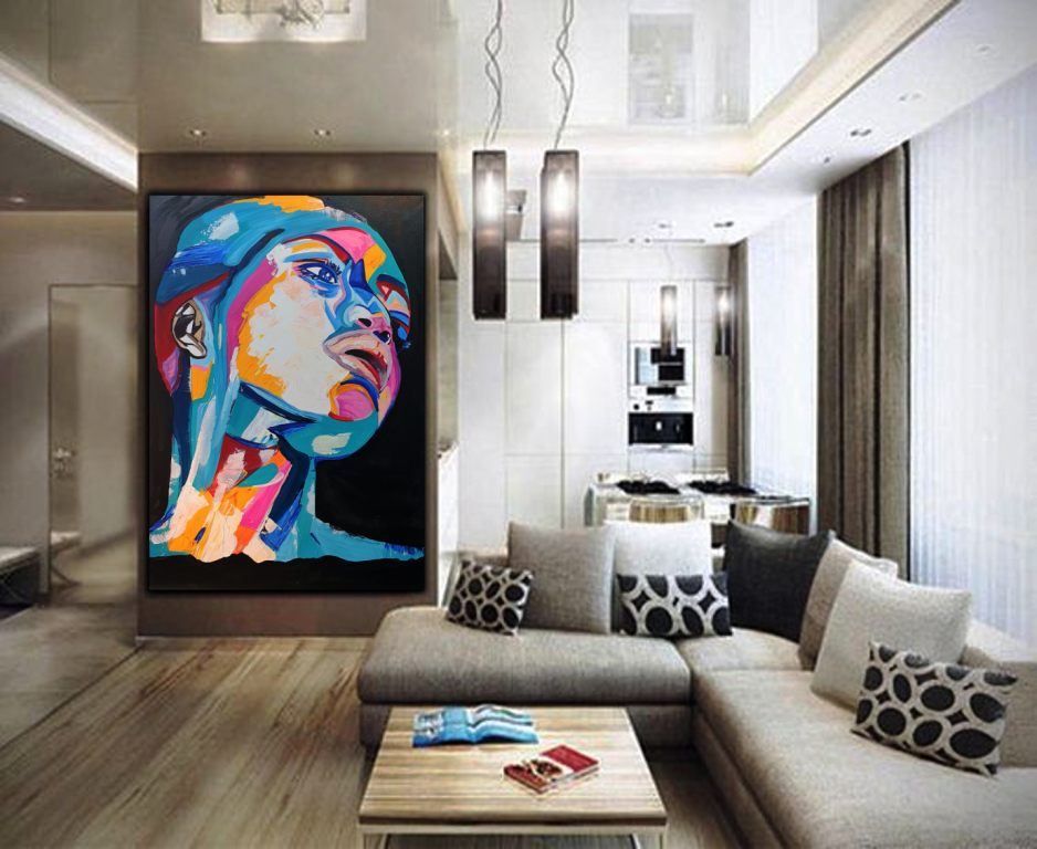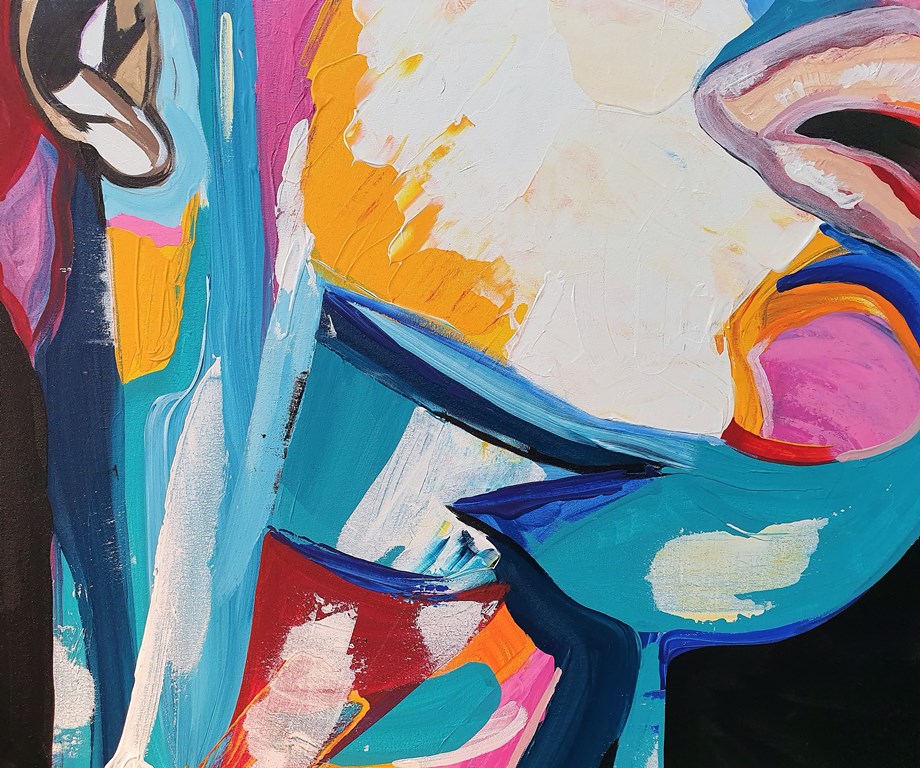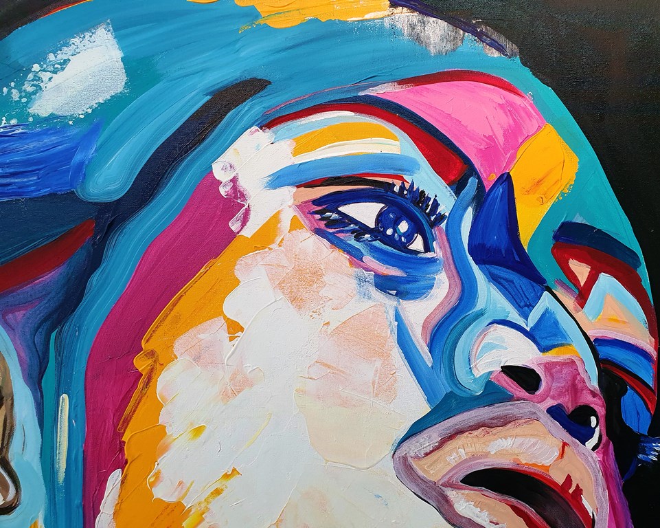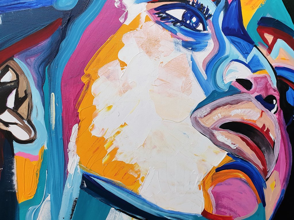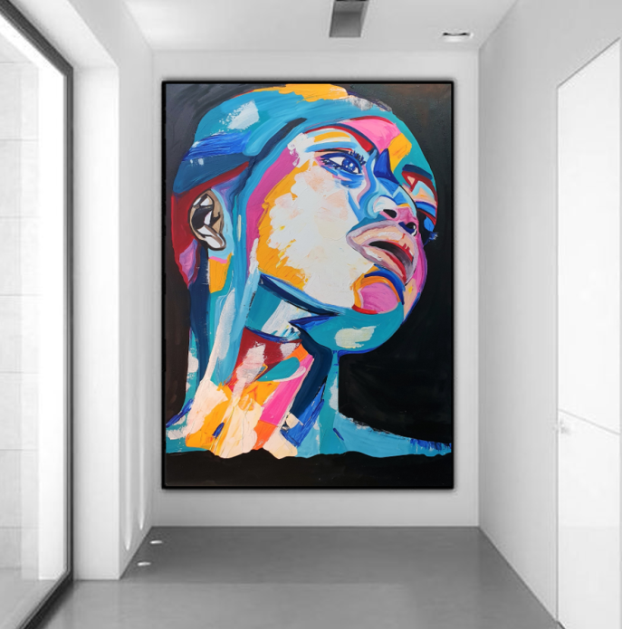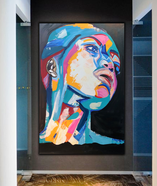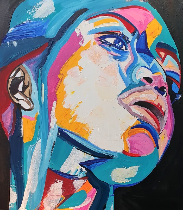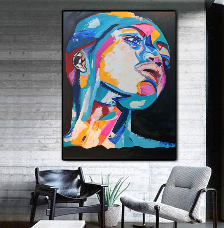 יצירה אבסטרקטית בעבודת יד של פני אישה עם צבעים בגוונים חיים…