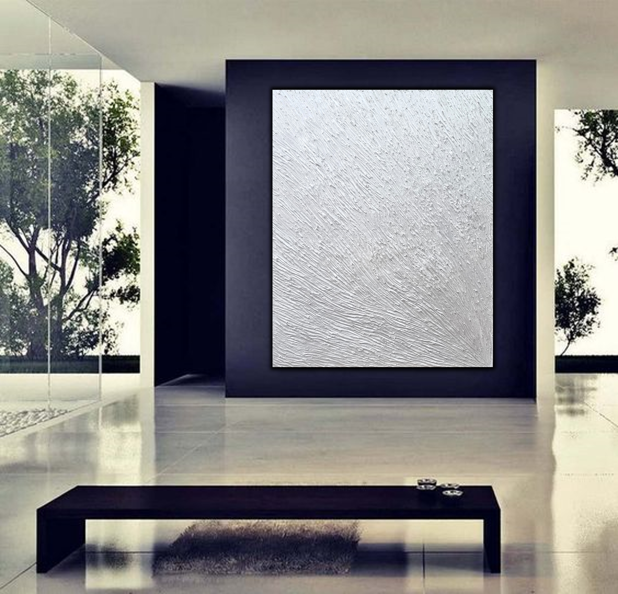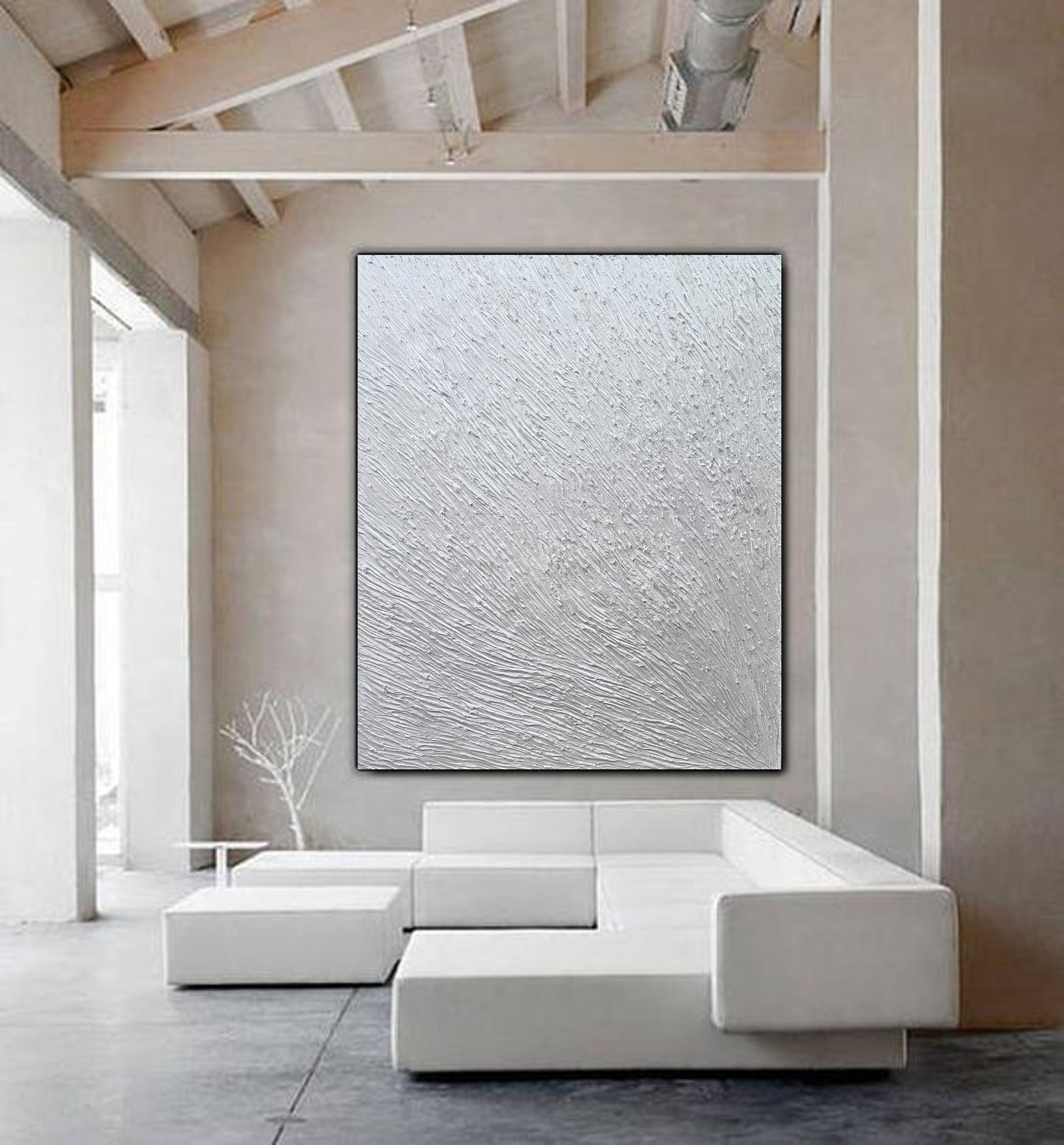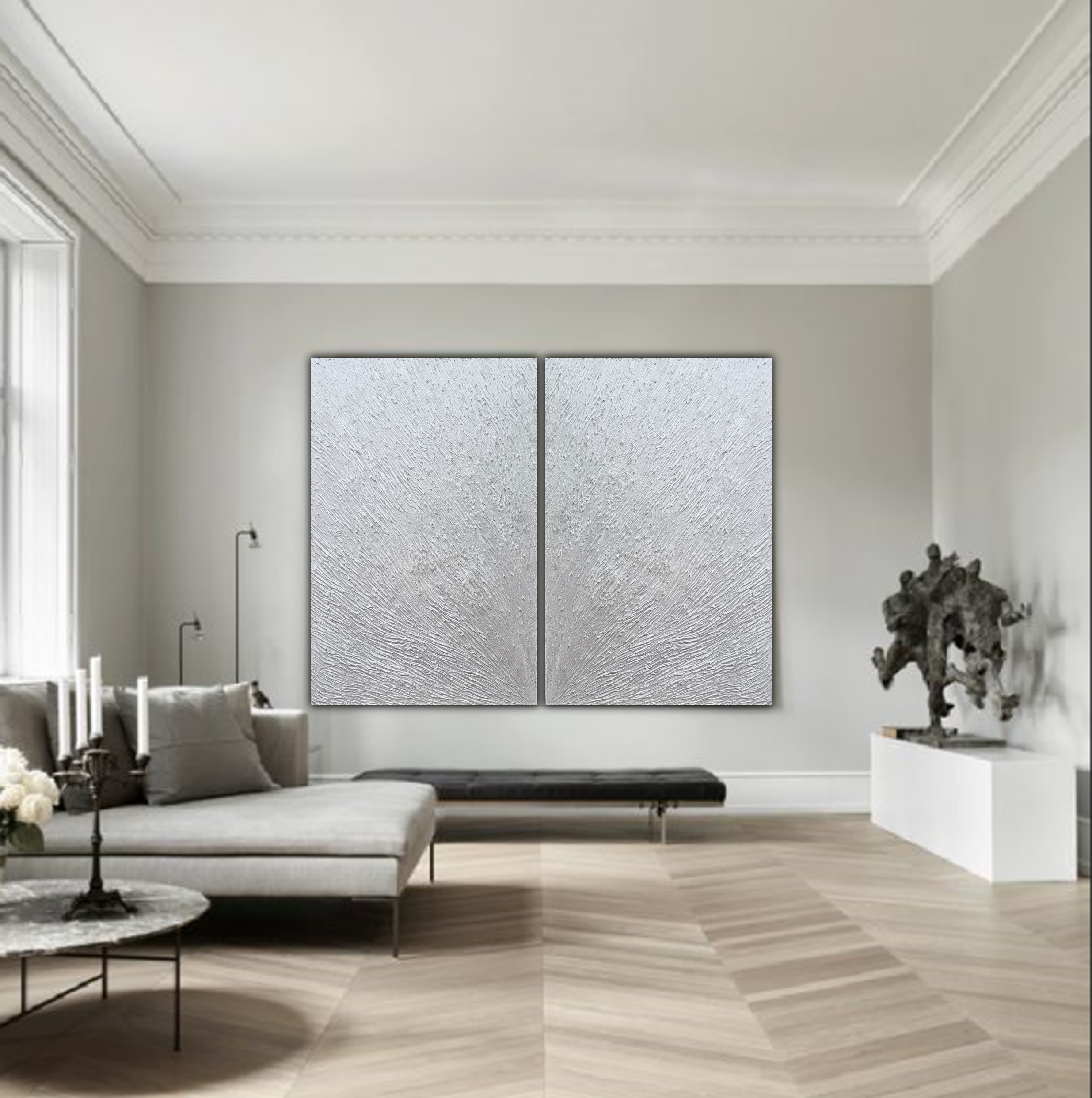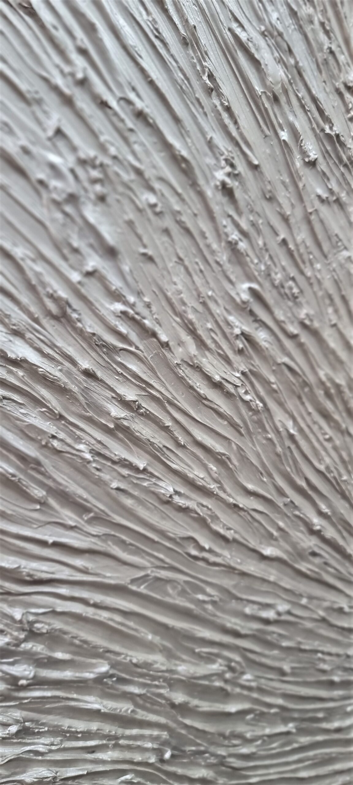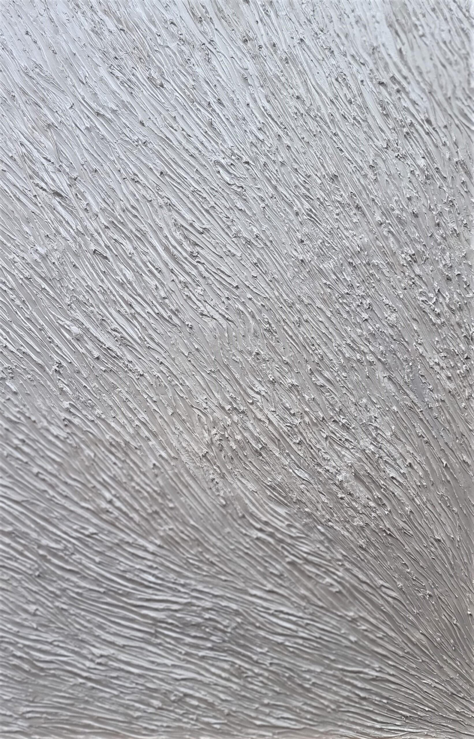 יצירה אבסטרקטית בגווני כסף ואפור מיטאלי עשיר עם בטקסטורות מובלטות על גבי הקנוואס